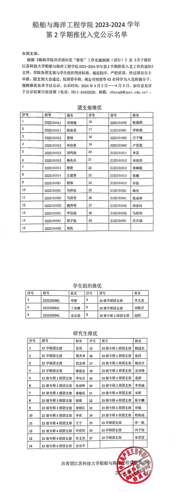 根据《英国威廉希尔公司共青团向党“推优”工作实施细则(试行)》及《关于做好英国威廉希尔公司2023-2024学年第2学期推优入党工作的通知》文件,学院各团支部与员工组织坚持标准,规范程序,严把质量,经过团员自主申报、团支部大会通过、院团委审核、公司党委核实,确定司明煜等62名同学为入党积极分子,现将推优名单予以公示,公示时间:2024年4月2日——4月9日,如有意见请于公示结束日前反馈(电话:0511-84432020,邮箱:chxyxgb@just.edu.cn)。